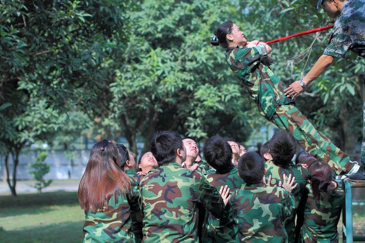 (二)信任背摔。团队中的每位队员站到一个1.5米的高台上,身体笔直向后倒,其他队员用手臂去接这名队员。训练旨在增强队员间的相互信任和理解,同时克服心理障碍,增加自信心、战胜恐惧,进而增强团队的凝聚力。