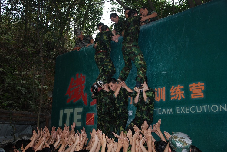 (六)毕业墙。全体团队的每个成员,不借助身体外的任何工具,齐心协力,在规定的时间内,翻越一面高达4.2米的光滑墙面。这是本次特训营的最后一个项目,是对全体参训团队整合团队增强士气和凝聚力最后的一个考验。